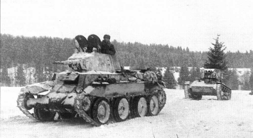 A BT-7 and a T-26 moving to the frontlines during the WWII in November 1941