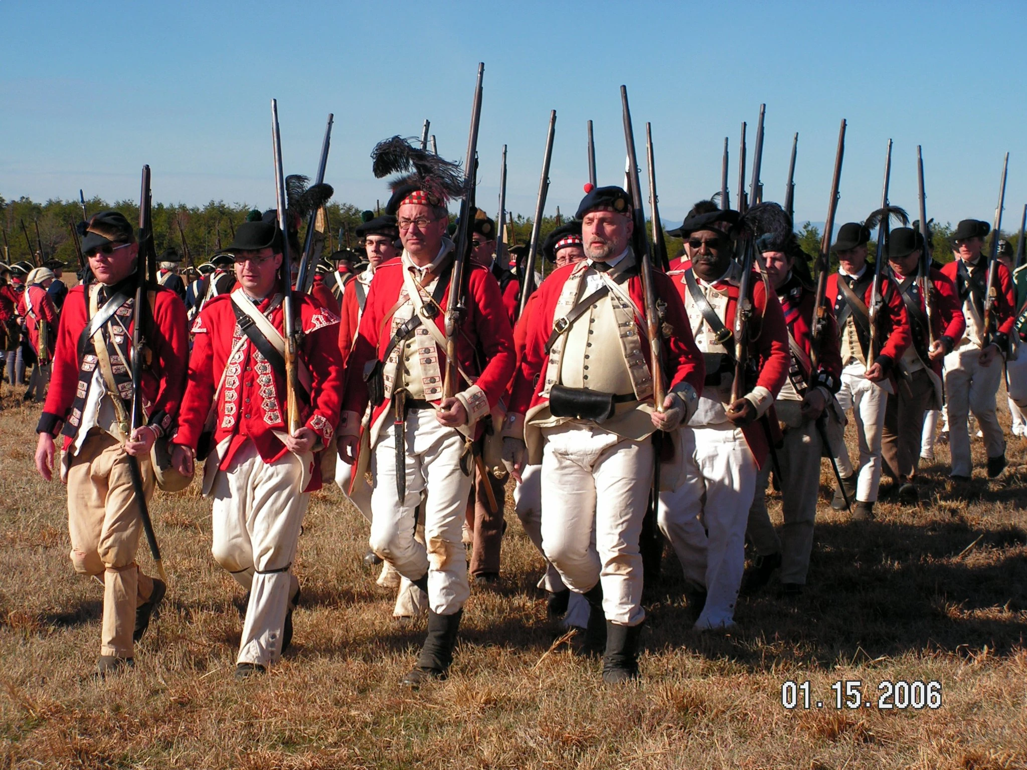Reenactors portraying Colonial troops march into battle at Cowpens