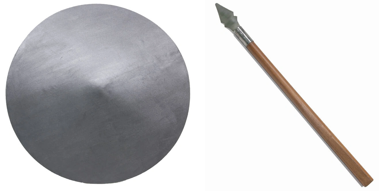 The Tinbe-Rochin is a weapons combination of a short spear (rochin) and a shield (tinbe), it is one of the least well-known Okinawan weapon systems. The tinbe can be made of various materials but is commonly found in vine, cane, metal, or turtle shell. The shield size is generally about 45 cm long and 38 cm wide. The length of the rochin is usually equivalent to the length of the forearm and can be found in many differing designs varying from spears to short swords and machete-style (seiryuto) implements. In use, the techniques tend to be circular in order to avoid excessive contact with the shield. The short spear is predominantly used in an upward stabbing motion, piercing armor under the rib cage, armpits, and throat although dependent upon the type of Rochin used, slashing motions can also be employed. [1]