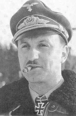 Walther Dahl (27 March 1916 – 25 November 1985) was a German Oberst Luftwaffe fighter ace and recipient of the Knight's Cross of the Iron Cross with Oak Leaves (German language: Ritterkreuz des Eisernen Kreuzes mit Eichenlaub) during World War II. The Knight's Cross of the Iron Cross and its higher grade Oak Leaves was awarded to recognise extreme battlefield bravery or successful military leadership. A flying ace or fighter ace is a military aviator credited with shooting down five or more enemy aircraft during aerial combat.[1] Dahl claimed some 128 enemy aircraft shot down in 678 missions, including about 300 ground-attack missions.[2]